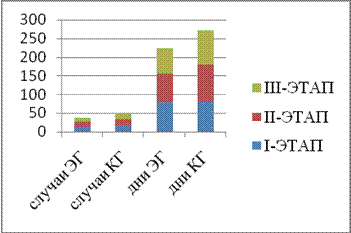 На втором этапе заболеваемость ОРВИ в ЭГ – 37,93 %, в сравнении с КГ – 62,06 %, по случаям и длительности 44,25 % в ЭГ и 55,74 % в КГ, соответственно. Всего заболеваемость ОРВИ на втором этапе в ЭГ была меньше на 24,13 % по случаям и на 11,49 % по дням.