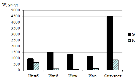 Величина улучшения результатов тестов (W) у мужчин ЭГ значительно превосходит аналогичные показатели мужчин КГ по всем исследуемым параметрам (рис. 1). Наибольшее улучшение результатов (W) у мужчин ЭГ отмечаются в сит-тесте. Таким образом, полученные результаты свидетельствуют о несомненном положительном влиянии предлагаемой технологии адаптивной двигательной рекреации в санаторно-курортных условиях.