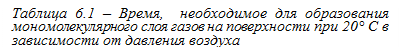 Из табл. 6. 1 следует, что даже вакуум 10–9 мм рт. ст. не предохраняет поверхности металла от возникновения на них слоев из молекул газа. Ювенильная металлическая поверхность может существовать очень короткие моменты времени в изломе металла при совместном деформировании двух частей металла в местах их соприкосновения или после его механической обработки. После механической зачистки поверхности металла в атмосфере сухого воздуха на ней образуется окисленная пленка (табл. 6.2).