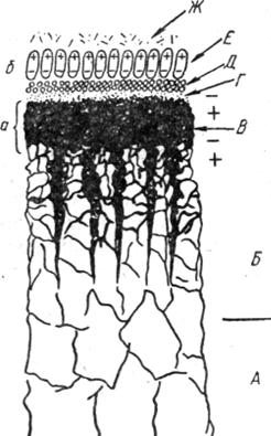 Толщина и последовательность расположения таких пленок может быть различной. Однако непосредственно на поверхности металла обычно находится пленка окислов (рис. 6.2, слой а).
