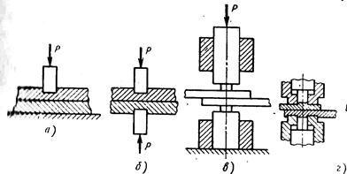 Листы толщиной 0,2–15 мм сваривают внахлестку путем вдавливания в толщу металла с одной или с двух сторон пуансонов (рис. 6.3). Соединения выполняют в виде отдельных точек или непрерывного шва. Ширину или диаметр пуансона выбирают в зависимости от толщины свариваемого материала (δ): r = (1…З)δ.