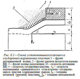 При установившемся процессе сварки метаемая пластина на некоторой длине дважды перегибается и, если соединяемые поверхности перед сваркой были установлены параллельно друг друга, ее наклонный участок со скоростью Vк, равной D,движется за фронтом детонационной волны, а участок, на котором находится непродетонированная часть заряда ВВ, под действием сил инерции остается в исходном состоянии (рис. 8.2). Соударение свариваемых металлов, происходящее под некоторым углом у, вызывает давление в десятки тысяч атмосфер. В местах прикосновения пластин появляется тангенциальная составляющая скорости соударения в направлении движения фронта детонационной волны, вследствие этого происходит совместное деформирование поверхностных слоев свариваемых листов. Такое деформирование имеет характер вязкого течения и способствует тесному сближению свариваемых поверхностей.