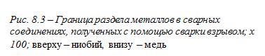 Профиль деформированной зоны металла в образующемся сварном соединении обычно имеет волнообразный вид (рис. 8.3). Окисные пленки и другие поверхностные загрязнения дробятся и рассредоточиваются со слоями деформирующего металла аналогично явлению при холодной сварке и частично уносятся в виде тонкой пыли под действием кумулятивного эффекта. Исследования показали, что при сварке взрывом отсутствует зона, состоящая из смеси соединяемых металлов.