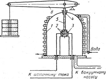 Схема процесса диффузионной сварки в вакууме представлена на рис. 9.1. В вакуумной охлаждаемой камере 1 размещают свариваемое изделие 2 и нагреватель 3. Для сдавливания деталей в процессе сварки используют механизм сжатия, состоящий из штока 5 и механизма нагружения 6, шток проходит через вакуумное уплотнение или сильфон 4.