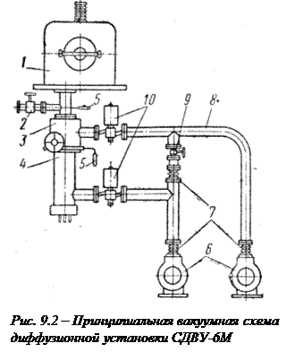 На рис. 9.2 представлена вакуумная система установки СДВУ-6М, которая состоит из сварочной камеры 1 с вентилем 2 для пуска воздуха. К камере через высоковакуумный затвор 3 присоединен паромасляный насос 4.