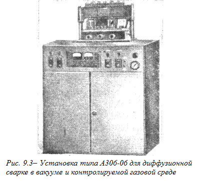 Для сварки деталей и узлов электровакуумных приборов используют установку А306-04, позволяющую сваривать в вакууме и контролируемой атмосфере при нагреве деталей с помощью т. в. ч. с одновременным прижатием соприкасающихся поверхностей свариваемых деталей.