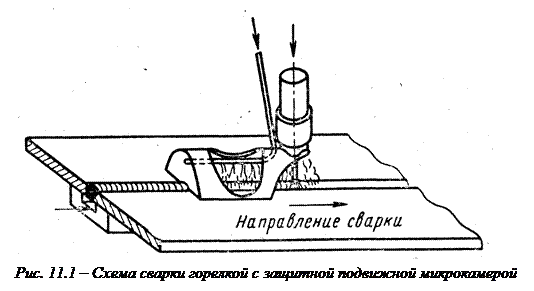 Более совершенный метод сварки с защитой инертными газами – сварка с использованием защитных кожухов (микрокамер), представляющих собой небольшие подвижные камеры, которые позволяют защитить не только ванну расплавленного металла, но и значительную область металла околошовной зоны, нагретого до высоких температур.