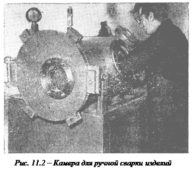 В камерах с контролируемой атмосферой можно сваривать плавящимся и неплавящимся электродами вручную или же автоматами. В камере для ручной сварки (рис. 11.2) могут работать одновременно два сварщика, для чего в камере имеется две пары отверстий с резиновыми перчатками.