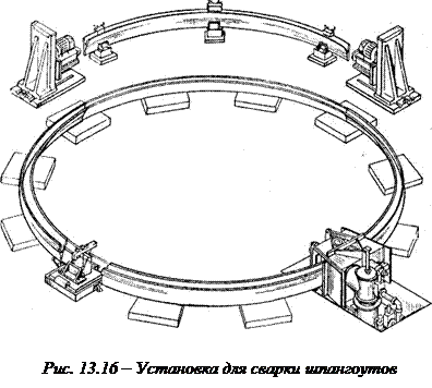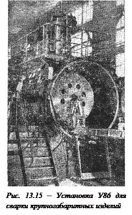 На рис. 13.16 представлена схема установки фирмы Sciaкy для сварки шпангоутов ракет диаметром до 10 м, имеющих четыре сварных стыка. В этой установке камера накладывается на место соединения и соответствующим образом герметизируется.