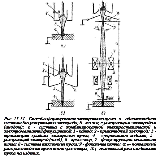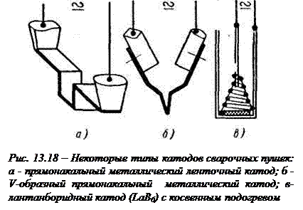 Наиболее совершенны пушки с комбинированной электростатической и электромагнитной фокусировкой пучка. Пушка состоит из катода прикатодного электрода, ускоряющего электрода-анода и электромагнитной фокусирующей системы (рис.13.17, в). Катоды электронных пушек должны удовлетворять ряду требований: они должны обладать высокими эмиссионными свойствами, устойчиво работать в условиях вакуума, используемого при сварке, иметь достаточную долговечность и т. п.