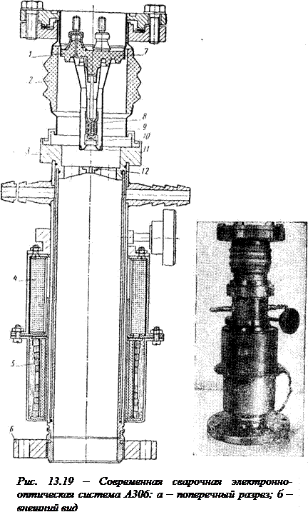 Отклоняющие системы, используемые в электроннолучевых пушках, предназначены для отклонения луча на заданное расстояние и для точной установки его на кромки свариваемого изделия. Электромагнитные отклоняющие системы изготовляют в виде четырех катушек соединенных последовательно попарно, расположенных под углом 180° друг к другу. Изменяя ток в катушках, можно устанавливать луч в любой заданной точке. Этот вид отклоняющей системы использован в отклоняющих системах телевизионных кинескопов. Отклоняющую систему можно использовать для передвижения луча и по сложным кривым: кругу, эллипсу, квадрату и т. п. Другой вид электромагнитных отклоняющих систем изготовляют по типу обмоток роторов динамомашин. На рис. 13.19 а, б – представлена современная электронно-оптическая система, предназначенная для сварочных работ. Эта система состоит из следующих основных узлов: электронной пушки А-306 1, изолятора 2, анодного узла 3, фокусирующей 4 и отклоняющей систем 5 и фланца 6.
