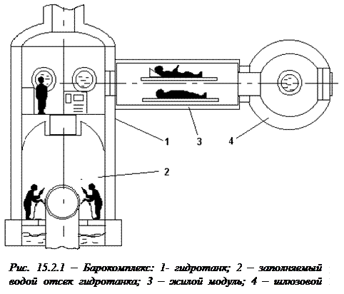 Сварку выполняют в сухой глубоководной камере, которая вмещает в себя как сварщика, так и сварной узел. Сварка в такой камере осуществляется в абсолютно сухой среде. Сварные швы, полученные в ней, не отличается по качеству от сварных швов, сделанных на суше. Однако сухая глубоководная камера очень громоздка, Ее сооружение длительный, дорогостоящий и сложный процесс, требующий использования вспомогательных судов и плавучих кранов. Для создания естественной среды камеру с открытым дном или подводную сварочно-монтажную камеру устанавливают на места будущих соединений труб. После того как между трубой и камерой помещены уплотнения, а внутри труб – пневматические заглушки, газ, находящийся в водолазном снаряжении, вытеснят морскую воду из камеры. Затем сварщик-водолаз входит в камеру и выполняет сварку в сухой среде. Термин "сварка в сухой среде" обозначает сваривание при высоком гидростатическом давлении сварщиком-водолазом, полностью находящимся в сухой среде, созданной под водой. На рис.15.2.1 представлен барометрический комплекс, состоящий из гидротанка, жилого и шлюзового модулей. Гидравлический танк барокомплекса имеет диаметр 3,7 м и состоит из двух отсеков: верхнего и нижнего, заполненного водой. Жилой модуль (внутренний диаметр 2,14м) одновременно является декомпрессионной камерой и соединяет верхнюю часть гидротанка со шлюзовым модулем. Шлюзовой модуль, в котором всегда поддерживается атмосферное давление, используется в случае необходимости принять людей или передать крупные предметы в жилой модуль, в то время когда он находится под давлением. Гидравлический танк и жилой модуль оборудованы индивидуальными системами жизнеобеспечения, которые поддерживают нужную температуру, влажность, парциальное давление кислорода; удаляют из камеры двуокись углерода и другие вредные примеси, обусловленные жизнедеятельностью организма. Сварщики вдыхают смесь гелия и кислорода, в которой в независимости от глубины поддерживается парциальное давление кислорода 29,4 кПа.