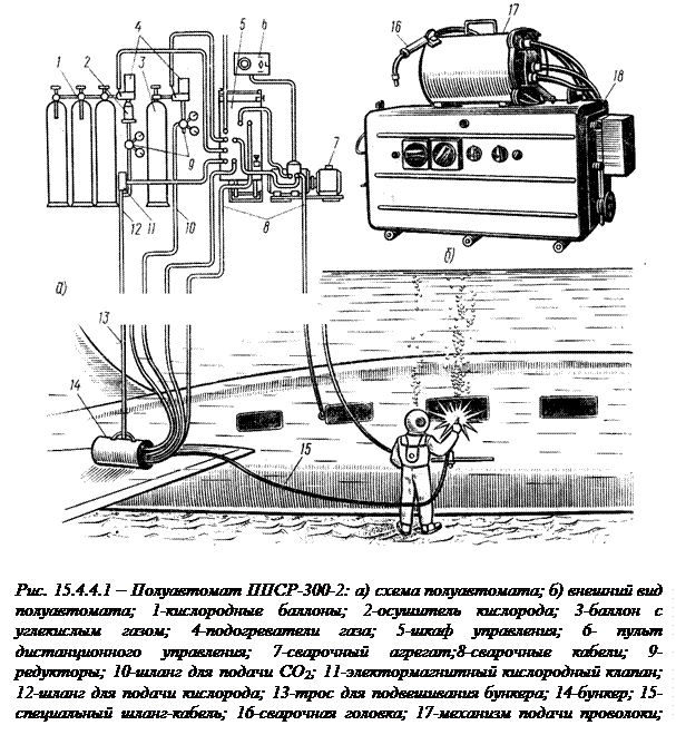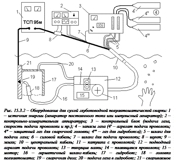 Оборудование для полуавтоматической подводной сварки с непрерывной подачей проволоки схематически изображено на рис. 15.3.2 [3, 8].