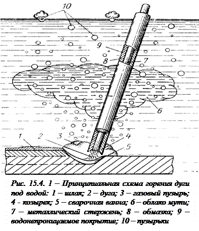 Способ дуговой сварки под водой основан на способности дуги устойчиво гореть в парогазовом пузыре при интенсивном охлаждении окружающей водой (рис 15.4.1). Газовый пузырь образуется за счёт испарения и разложения воды, паров и газов расплавленного металла и обмазки электрода [1 – 3].