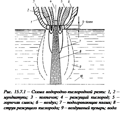 Наибольшее распространение получили водородно-кислородная и бензокислородная резка. Подогревающее пламя образуется за счет водородно-кислородной смеси, подаваемой по кольцевому каналу между мундштуками 1 и 2 (см. рис. 15.7.1). Между наружным колпачком 3 и мундштуком 2 подается сжатый воздух для создания пузыря и предохранения пламени от соприкосновения с водой. Режущий кислород поступает по центральному каналу мундштука 4.