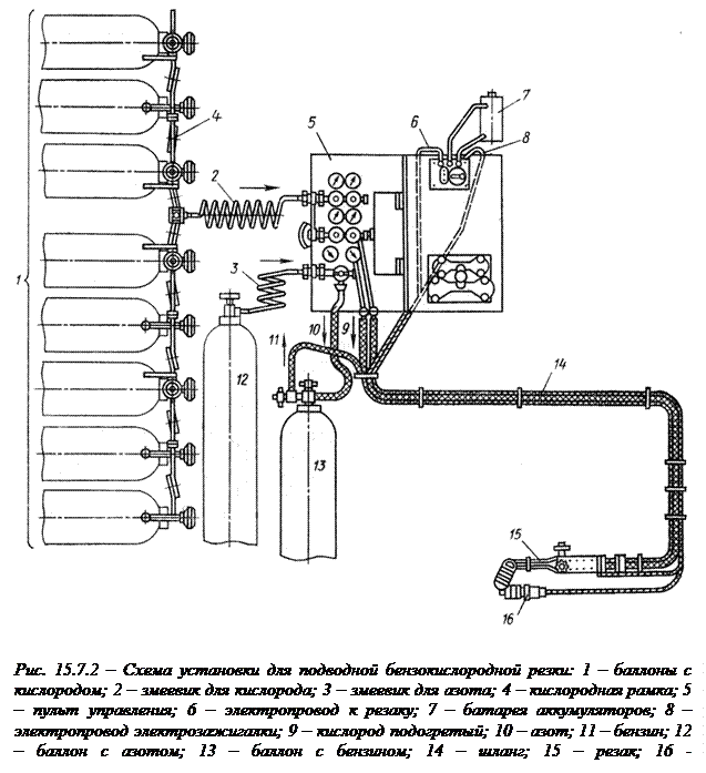 Схема установки для питания резака бензином и кислородом показана на рис. 15.7.2. В комплект установки входит батарея из 6-12 баллонов кислорода, баллоны с бензином и азотом, батарея аккумуляторов, резак и электрозажигалка. На пульте управления для понижения давления установлены два кислородных редуктора и азотный редуктор. Бензин подается под давлением азота. Бензорез за 1 час расходует 30-50 м3 кислорода, 10-20 кг бензина; расход азота незначителен. Скорость резки бензино-кислородным пламенем выше, чем водородно-кислородным, на 20-30%.