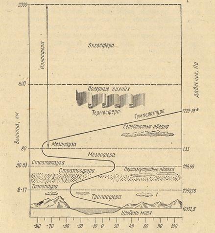 Стратосфера (слоистая оболочка). Она простирается над тропосферой до высот 50—55 км. Воздух в стратосфере сильно разрежен и нагрет. Давление в 1000 раз меньше, чем в приземном слое, температура от —10 до +10°С. Водяные пары в стратосфере почти отсутствуют. Иногда во время сильных гроз кучевые облака тропосферы проникают в стратосферу, образуя удивительные по своей красоте перламутровые облака. Пылеватые частицы попадают в стратосферу в основном из космоса. Физический режим стратосферы оказывает влияние на соседние с ней оболочки — тропосферу и мезосферу.