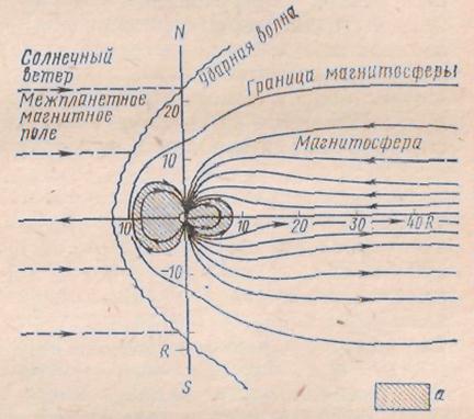 Очень важной особенностью геомагнитного поля является его способность задерживать потоки солнечной плазмы, не пропускать их к поверхности Земли. Удерживаемые в верхних слоях атмосферы заряженные частицы накапливаются и образуют радиационный пояс (на рис. 8 выделен штриховкой).