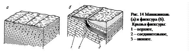 Флексурами называются уступообразные нарушения горизонтально (или моноклинально) лежащих пластов (рис. 14, б). Флексуры обычно возникают при блоковых смещениях нижележащих пород. При смещениях небольшой амплитуды разрыва не происходит, но мощность пород в зоне сдвига часто бывает сокращенной. У флексур различают нижнее, соединительное и верхнее крылья. Соединительное крыло представляет собой участок, на котором пласты имеют крутой наклон и сокращенную мощность.