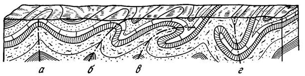 а – нормальная, б - изоклинальные, в – веерообразные, г – перевернутая