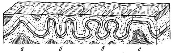 По особенности строения в поперечном разрезе складки делятся на ряд типов. По положению осевой поверхности и крыльев выделяют прямые, наклонные, лежачие и перевернутые складки. У прямых складок осевая поверхность вертикальная, а крылья располагаются симметрично (рис. 17, а). Осевая поверхность наклонных складок наклонена, крылья падают в разные стороны (рис. 17, б). Разновидностью наклонных являются опрокинутые складки, оба крыла которых наклонены в одну сторону. У лежачих складок осевая поверхность находится в положении, близком к горизонтальному, крылья почти параллельны друг другу (рис. 17, б). Осевая поверхность перевернутых складок находится ниже горизонтальной плоскости, крылья развернуты (рис. 170, г ).