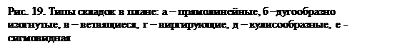 Линейные складки в плане бывают прямолинейными, дугообразно изогнутыми, ветвящимися, виргирующими, кулисообразными и сигмовидными (рис. 19). Часто по