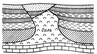 Своеобразной формой куполовидных прерывистых складок являются диапиры (купола с ядром протыкания). Характерные особенности диапиров — наличие пластичных пород (соль, гипс, глины и др.) в ядре и закономерное увеличение угла наклона пластов от крыльев к ядру складки (рис. 20). Если ядра сложены каменной солью, складки называются соляными куполами. Диапиры образуются при выдавливании высокопластичных пород ядра складки (соль, гипс, глина) вверх, в область пониженного горного давления. В результате диапировые ядра приобретают различные формы — линз, штоков, грибов и т. д.