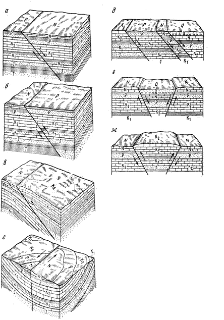Рис. 22. Дизъюнктивные дислокации: а – сброс, б – взброс, в – надвиг, г – сдвиг, д – ступенчатый сброс, е – грабен, ж - горст