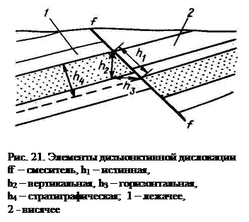 2. Дизъюнктивы – это разрывы с заметным смещением пород друг относительно друга. Они проявляются в виде трещин или зон дробления, по которым происходит смещения пластов. Плоскость разрыва, по которой происходит относительное перемещение пластов горных пород, называется сместителем (рис. 21). Примыкающие к этой плоскости участки горных пород называются крыльями (или блоками). При наклонном сместителе различают висячее и лежачее крылья (блоки). Величина относительного перемещения пластов по сместителю называется амплитудой разрыва. Различают амплитуды: истинную (наклонную) — расстояние в плоскости сместителя между кровлей или подошвой одного и того же пласта в висячем и лежачем крыльях; вертикальную — проекция истинной амплитуды на вертикальную плоскость; горизонтальную — проекция истинной амплитуды на горизонтальную плоскость; стратиграфическую — расстояние по нормали между кровлей или подошвой одного и того же пласта в висячем и лежачем крыльях.