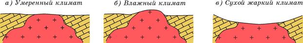 В условиях влажного климата известняки будут подвергаться интенсивному растворению и выщелачиванию, и на их месте будут понижения в рельефе, а в местах выхода гранитов – возвышенности.В сухом жарком климате граниты будут разрушаться быстрее, чем известняки и на поверхности будут формироваться понижения в рельефе.