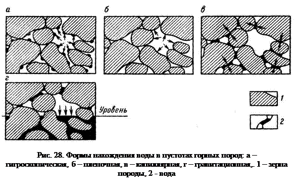 Гигроскопическая вода в виде сплошной одномолекулярной пленки или отдельных мельчайших капелек покрывает стенки пустот (рис. 28, а). Она настолько прочно связана с частицами породы, что не способна передвигаться в пустотах породы под влиянием силы тяжести. Выделить гигроскопическую воду из породы можно только путем нагревания последней до температуры более 100°С, при которой вода переходит в парообразную фазу.