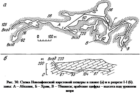 Наиболее изучена Новоафонская карстовая пещера, расположенная в известняковом массиве на Черноморском побережье Грузии. Это одна из самых крупных исследованных карстовых полостей — здесь выявлено восемь залов длиной от 50 до 275 м и высотой до 97 м (рис. 30). Общая протяженность пещеры достигает 1840 м. В пещере имеются три озера, уровень воды в которых располагается на высоте 40—42 м над уровнем моря.