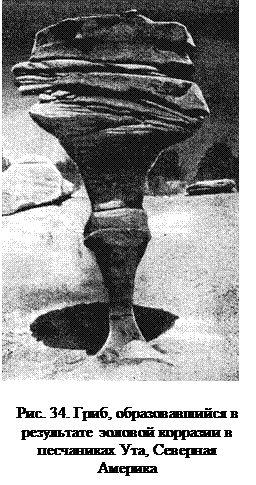 Корразия (обтачиваю) – механическая обработка обнаженных горных пород ветром при помощи переносимых им твердых частиц, что приводит к обтачиванию, царапанью, шлифованию, высверливанию углублений. Таким образом, на поверхности коренных пород образуются ниши и желоба, борозды, штрихи, цилиндрические и конические углубления (эоловые гроты, пещеры, котлы). Так как наибольшая концентрация песчаных частиц, переносимых ветром, наблюдается в нижних приземных частях на высоте 1.0 – 2.0 м, именно на этой высоте скалы подтачиваются быстрее и возникают своеобразные формы (рис. 34). Академик В.А. Обручев в 1906 году в Джунгарии открыл целый «Эоловый город» причудливых сооружений и фигур, созданных в мезозойских песчаниках и глинах благодаря процессам дефляции, корразии и физического выветривания.