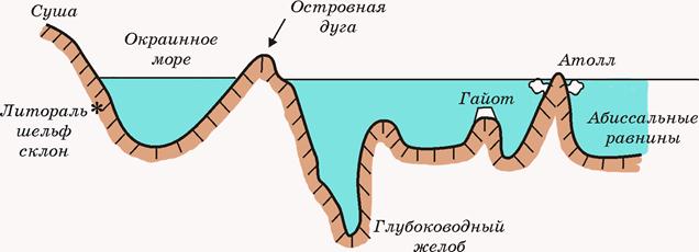 1) Континентальный шельф, 2) Континентальный склон с подводными каньонами, 3) Континентальное подножие, 4) Система срединно-океанических хребтов, 5) островные дуги, 6) Ложе океана с абиссальными равнинами, положительными формами рельефа (главным образом вулканами, гийотами и атоллами) и глубоководными желобами.