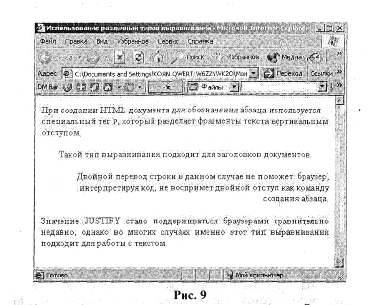 <Р ALIGN="JUSTIFY"> Значение JUSTIFY стало поддерживаться браузерами сравнительно недавно, однако во многих случаях именно этот тип выравнивания подходит для работы с текстом.</Р>