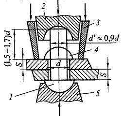 Сопрягаемые детали стягиваются заклёпкой 1, которая состоит из стержня круглого сечения и закладной головки (рис. 3.1). Заклёпку вставляют в совмещённые отверстия d0 и, осаживая выступающий конец стержня, образуют вторую замыкающую головку 4. Формирование этой головки производится с помощью обжимки 2. Закладная головка устанавливается в поддержке 5. При автоматической клёпке для улучшения формирования замыкающей головки используют нажимное кольцо 3. Процесс образования замыкающей головки называется клёпкой.