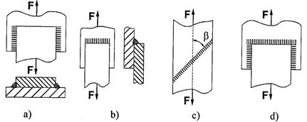 По расположению шва относительно линии действия силы различают лобовые (рис. 4.2, а), фланговые (рис. 4.2, b) косые (рис. 4.2, с) и комбинированные (рис. 4.2, d).