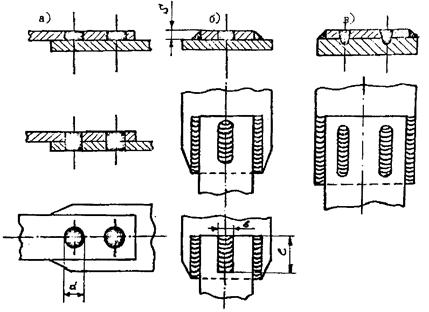 При значительной разнице толщины соединяемых деталей (для соединений малонагруженных) применяют пробочные, прорезные и проплавные швы (рис. 4.3)