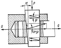 При забивании клина суммарные силы на рабочих гранях клина равнодействующие нормальных сил и сил трения наклонены на угол трения φ к нормалям в сторону, обратную перемещению клина рис. 7.5. В установочных клиновых соединениях усилие на стержне равно полезной нагрузке Q = Qвн.