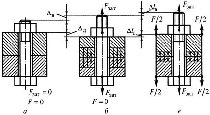 Болты, винты, шпильки, находящиеся под действием переменных нагрузок, рассчитываются на выносливость и становятся на рабочее место с предварительной затяжкой РЗ. В большинстве случаев переменная внешняя нагрузка на болт изменяется по отнулевому (пульсирующему) циклу. Так, например, нагружены шатунные болты.