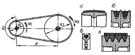 Ременная передача относится к передачам с гибкой связью. Состоит из двух шкивов (ведущего и ведомого), соединенных бесконечным ремнем, предназначена для передачи крутящего момента с одного вала на другой (рис. 10.1). Передача энергии происходит за счет трения, возникающего между ремнем и шкивами. При этом момент сил трения на шкивах должен быть равен моменту, движущему на ведущем и моменту сопротивления на ведомом. С увеличением угла обхвата шкива ремнем, натяжения ремня и коэффициента трения возрастает возможность передачи большей нагрузки.