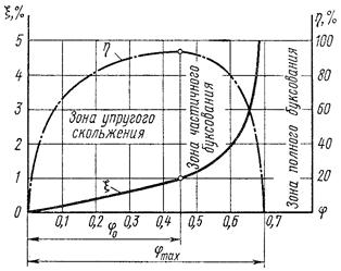 Точка перехода от прямолинейного участка к криволинейному называется критической точкой тяговой характеристики. Кривые скольжения и КПД показывают, что оптимальная нагрузка ременных передач лежит в зоне критических значений коэффициента тяги (φ0), наиболее высокий КПД.
