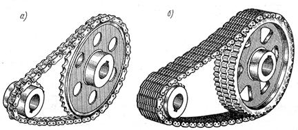 Наиболее широкое применение цепные передачи нашли в легких транспортных машинах (велосипеды, мотоциклы), в машинах непрерывного транспорта (конвейеры) в техническом машиностроении, в горном оборудовании и подъемно-транспортных устройствах. Втулочно-роликовые цепи (рис. 13, а) применяются при скоростях цепи не выше 15-18 м/с. Для более высоких скоростей (до 30 м/с) следует применять бесшумные зубчатые цепи (рис. 13, б).