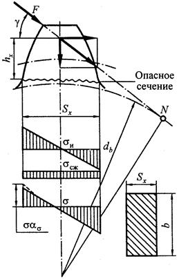 Наиболее опасное сечение, где наиболее вероятен излом зуба, находится у его корня в зоне наибольшей концентрации напряжений. Максимальное напряжение возникает на стороне сжатия (нерабочая сторона). Однако следует отметить то, что расчет на прочность необходимо производить по напряжению на рабочей стороне, т.к. на этой растянутой стороне зуба здесь может образоваться усталостная трещина.