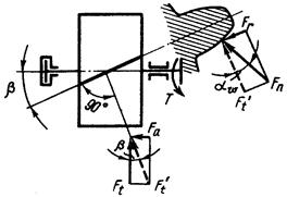 Рис. 14.1. Схема сил, возникающих в косозубом зацеплении