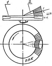 Представим, что конус 2 является заготовкой, на которой надо нарезать зубья, а вместо зубьев ППК (1) имеются резцы 1 и 2, которые перемещаются по направлению зуба в радиальном направлении к центру диска 1 (ППК) и обратно, нарезая канавку на поверхности конуса 2 (заготовки). При этом заготовка 2 перекатывается по вращающемуся ППК (1) без скольжений.
