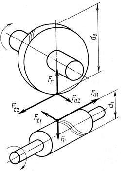 Рис. 17.5.Силы, действующие в червячном зацеплении