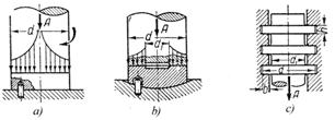 Пяты – участки валов, которыми они опираются на подшипник и воспринимают осевую нагрузку. Пята может быть сплошной (рис. 20.2, а); кольцевой (рис. 20.2, b); гребенчатой (рис. 20.2, c). Подшипник в этом случае называют подпятником.