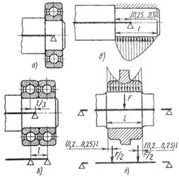 Валы и оси обычной конструкции рассчитываются как балки на шарнирных опорах, если они установлены на подшипниках качения по одному в каждой опоре «а» или по два «б» если опоры самоустанавливающиеся (рис. 20.5).
