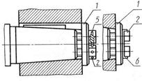 Фиксирование группы колес. Комплект колес установлен между двумя парами закладных полуколец, удерживаемых пружинными стопорными кольцами. На шлицевой втулке 1 нарезана резьба. При завинчивании чайки создается осевая распорная сила, необходимой величины.